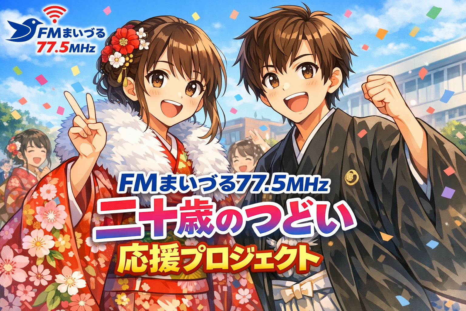 「FMまいづる77.5新成人応援プロジェクト」は、未来の舞鶴を担う新成人をオール舞鶴で応援する2017年から毎年行っているFMまいづる77.5MHzのラジオキャンペーンです。平成5年2023年からは「二十歳のつどい応援プロジェクト」として、舞鶴市外に住む新成人もインターネットを介し、今の舞鶴の情報、地域コミュニティ、地元企業などと持続的に繋がれるよう、様々な取り組みを行っています。